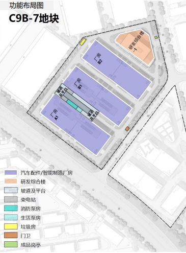 技术指标:厂房一层层高7.8米,二层层高7.0米,荷载20KN/㎡;三、四层层高5.5米,荷载10KN/㎡,可面向不同需求,并配有汽车坡道,方便装卸。研发综合楼层高5米左右,荷载8KN/㎡,可用于研发办公,并配套员工活动及展示、会议和食堂等。
